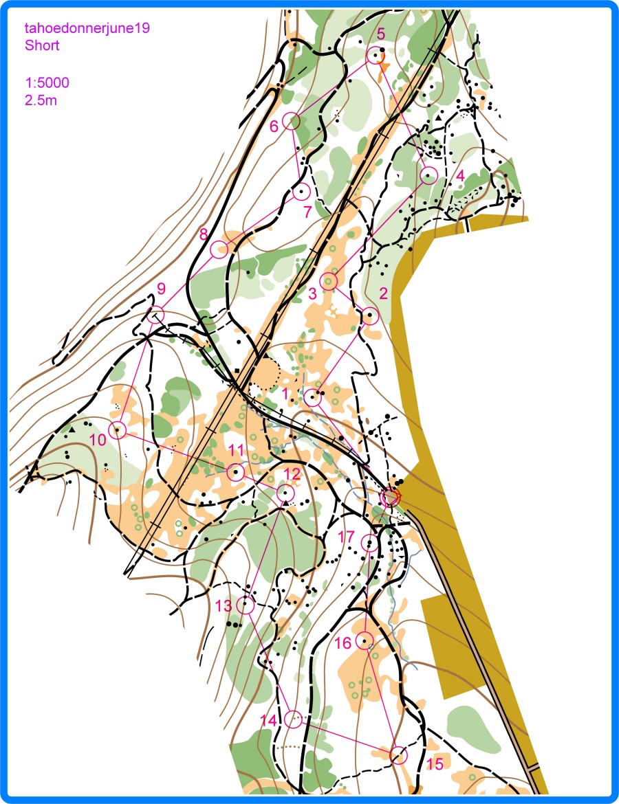 The map. We did the big circles in order, with the sets of controls inside in any order. July 24 - Race: Tahoe DonnerGet in your warmup before BAOC's summerfest! I've got a big new section of map to play on. Parking and start at 6pm from the usual spot at the end of Alder Creek Rd (past the xc area) here. And we'll have many visiting dignitaries from Canada you can run against. Map: 1:5000, 5m contours. 3km course.