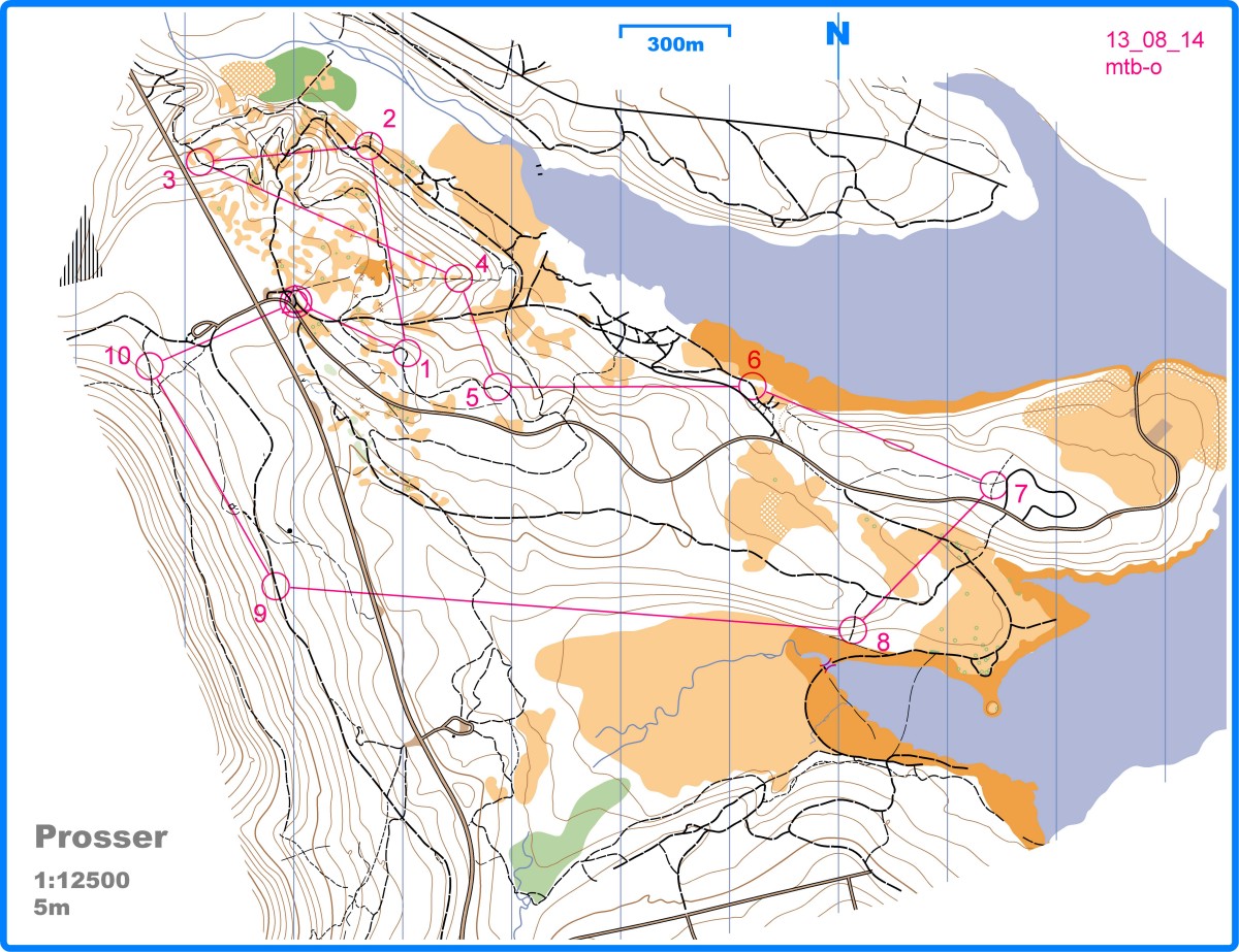 The map. Some of the contours are correct. August 14 - Training: Prosser MTB-O!MTB-O in Prosser. It will be awesome. Map is 1:12500, 5m contours, normal orienteering symbols (not the special mtb-o trail symbols). Course is 7.2 km straight line, 11.2 rideable (the distance along trails). For a map holder you can wear a ski-o one (as long as you never fall), try to attach the ski-o arm (without the base) to your handlebars, or just shove the map in your pocket or up the legs of the bike shorts. Parking and the start are the same place as last week, at 6pm.