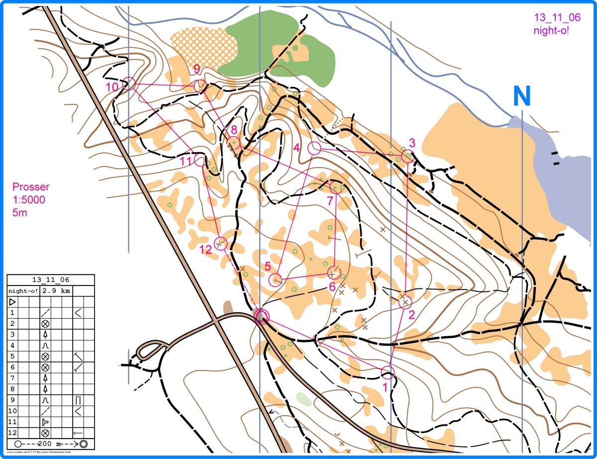 Night-o sprint in Prosser, 2.5 or 3 km or so. Its plenty dark by 6pm now, so out with the headlamps and lets go. We'll have some sort of semi-reflective flags out so its not too tough. Parking and the start at the same place off 89, a mile or so north of Alder Creek Rd, here (this is at the top of the hill, on the other side of 89 from the OHV trailhead). Map: 1:7500, 5m contours.
